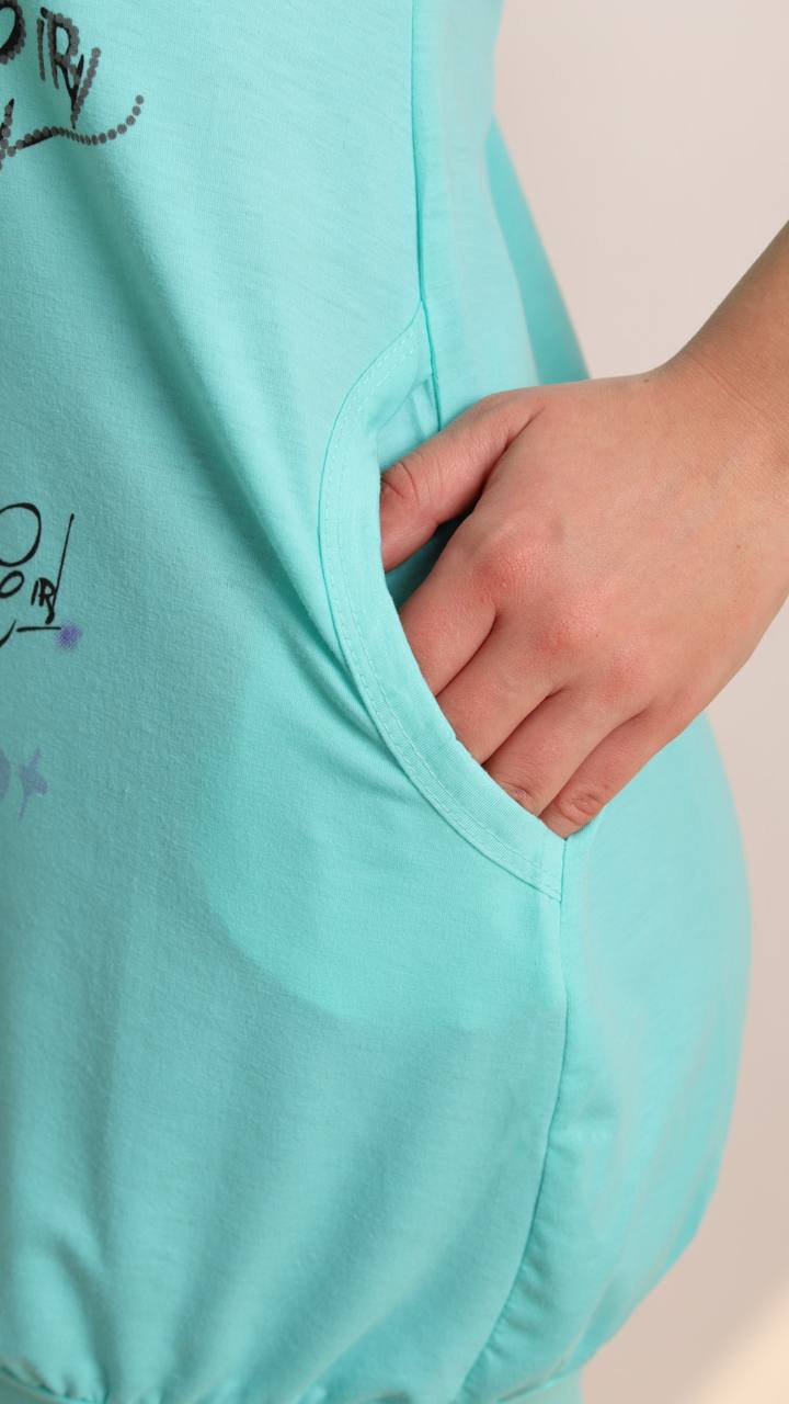 М'якенька тканина, як бамбук чи шось таке ніжне до тіла, як мої котики, но не теплі. Смужечка, принт ведмедик – все при ній. І фасон такий, що і вдома пройтися не соромно і людямм продати. А ще люди беруть шо би у тому всьому поспать , як у нічній сорочці, кажуть удобнєнько .