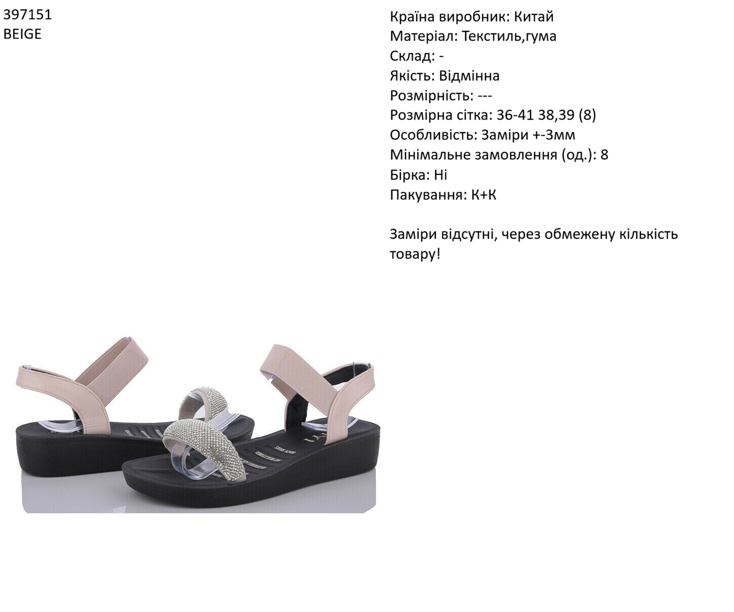 Країна виробник: Китай Матеріал: Екошкіра,гума Склад: - Якість: Відмінна Розмірність: --- Розмірна сітка: 36-41 38,39 (8) Особливість: Повтори можуть відрізнятись. Заміри +-3мм Мінімальне замовлення (од.): 8 Бірка: Ні Пакування: К+К ЗАМІРИ: == ВЗУТТЯ == Розмір 36: Висота п'яти: 3,5 см; Висота підошви: 1,5 см; Довжина устілки: 23 см; Розмір 37 : Висота п'яти: 3,5 см; Висота підошви: 1,5 см; Довжина устілки: 23,5 см; Розмір 38: Висота п'яти: 3,5 см; Висота підошви: 1,5 см; Довжина устілки: 24 см; Розмір 39: Висота п'яти: 3,5 см; Висота підошви: 1,5 см; Довжина устілки: 24,5 см; Розмір 40: Висота п'яти: 3,5 см; Висота підошви: 1,5 см; Довжина устілки: 25 см; Розмір 41: Висота п'яти: 3,5 см; Висота підошви: 1,5 см; Довжина устілки: 25,5 см;