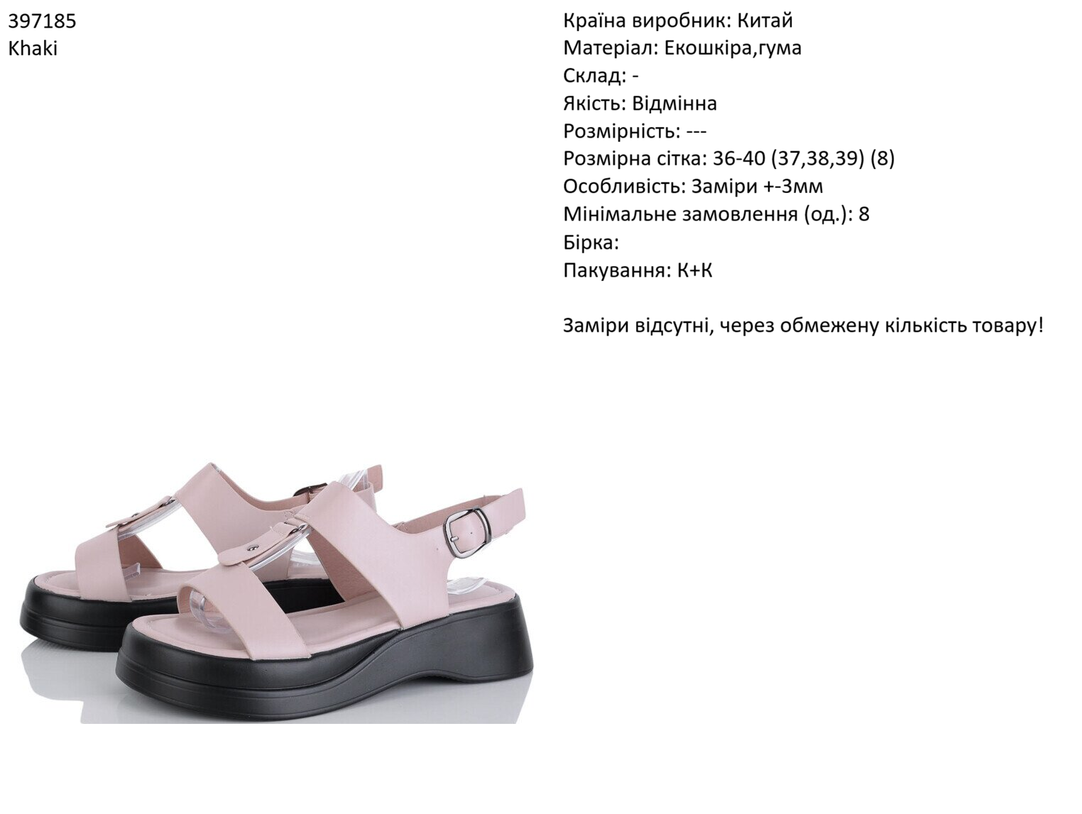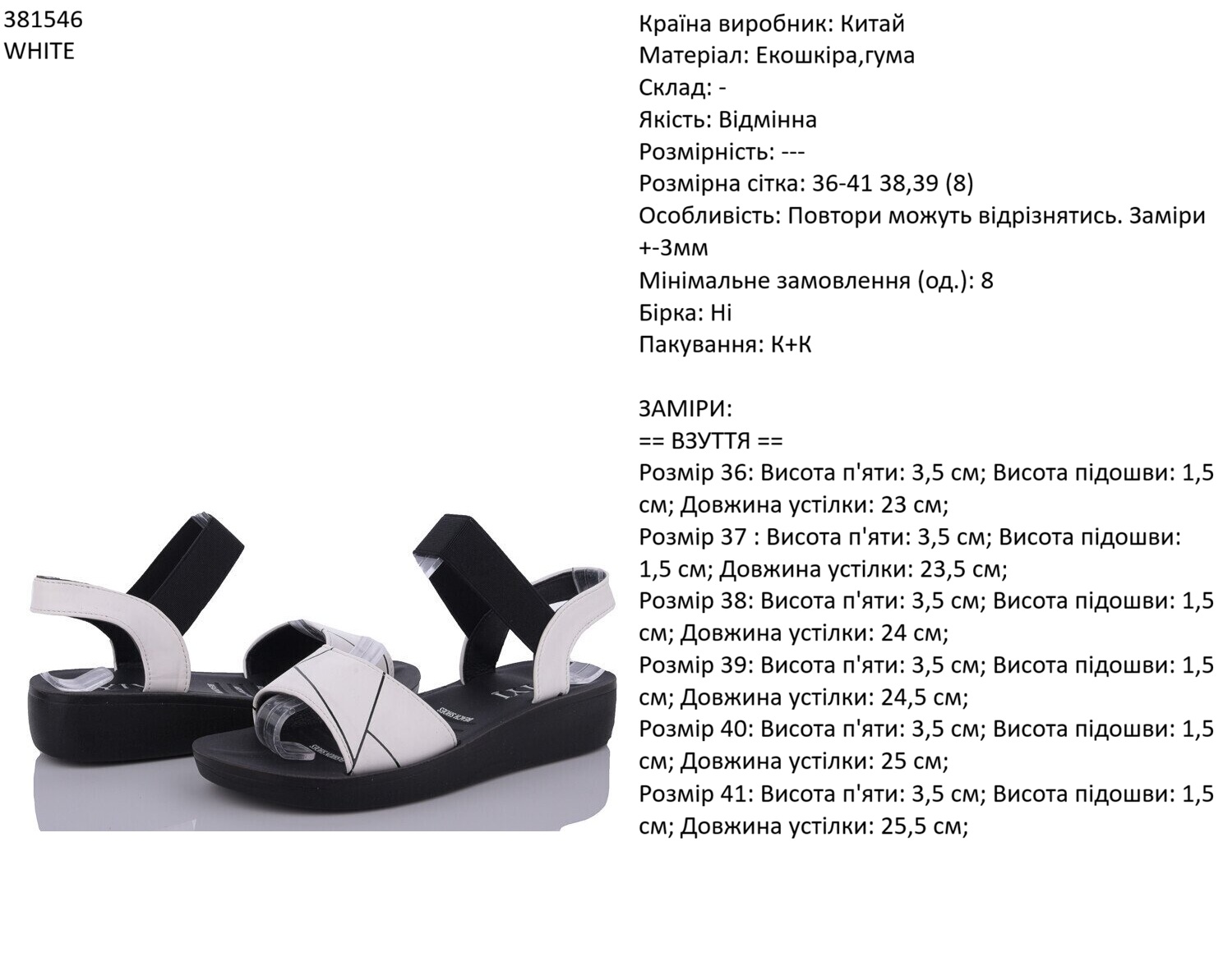 Країна виробник: Китай Матеріал: Екошкіра,гума Склад: - Якість: Відмінна Розмірність: --- Розмірна сітка: 36-41 38,39 (8) Особливість: Заміри +-3мм Мінімальне замовлення (од.): 8 Бірка: Ні Пакування: К+К Заміри відсутні, через обмежену кількість товару!