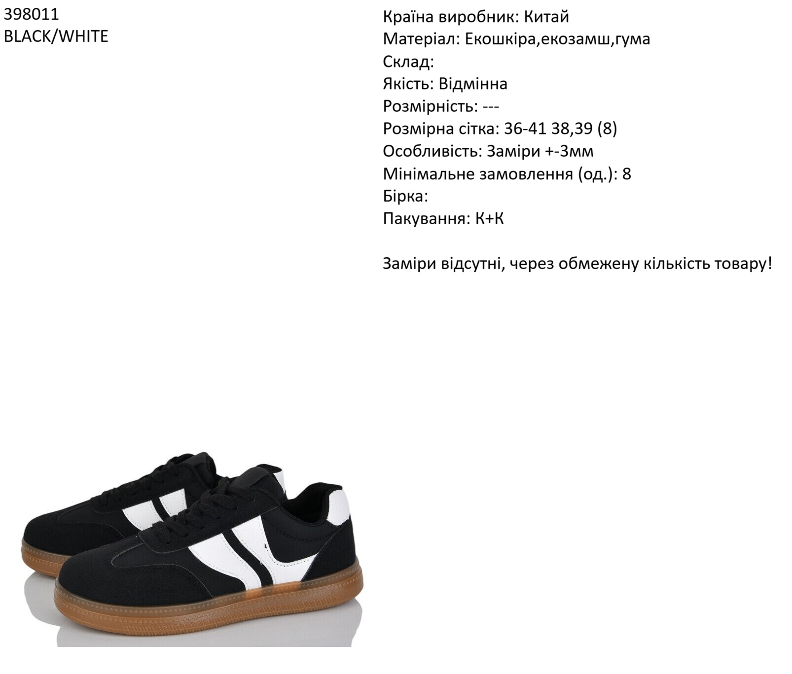 Країна виробник: Китай Матеріал: Текстиль,гума Склад: - Якість: Відмінна Розмірність: --- Розмірна сітка: 36-40 (37,38,39) (8) Особливість: Заміри +-3мм Мінімальне замовлення (од.): 8 Бірка: Пакування: К+К Заміри відсутні, через обмежену кількість товару!