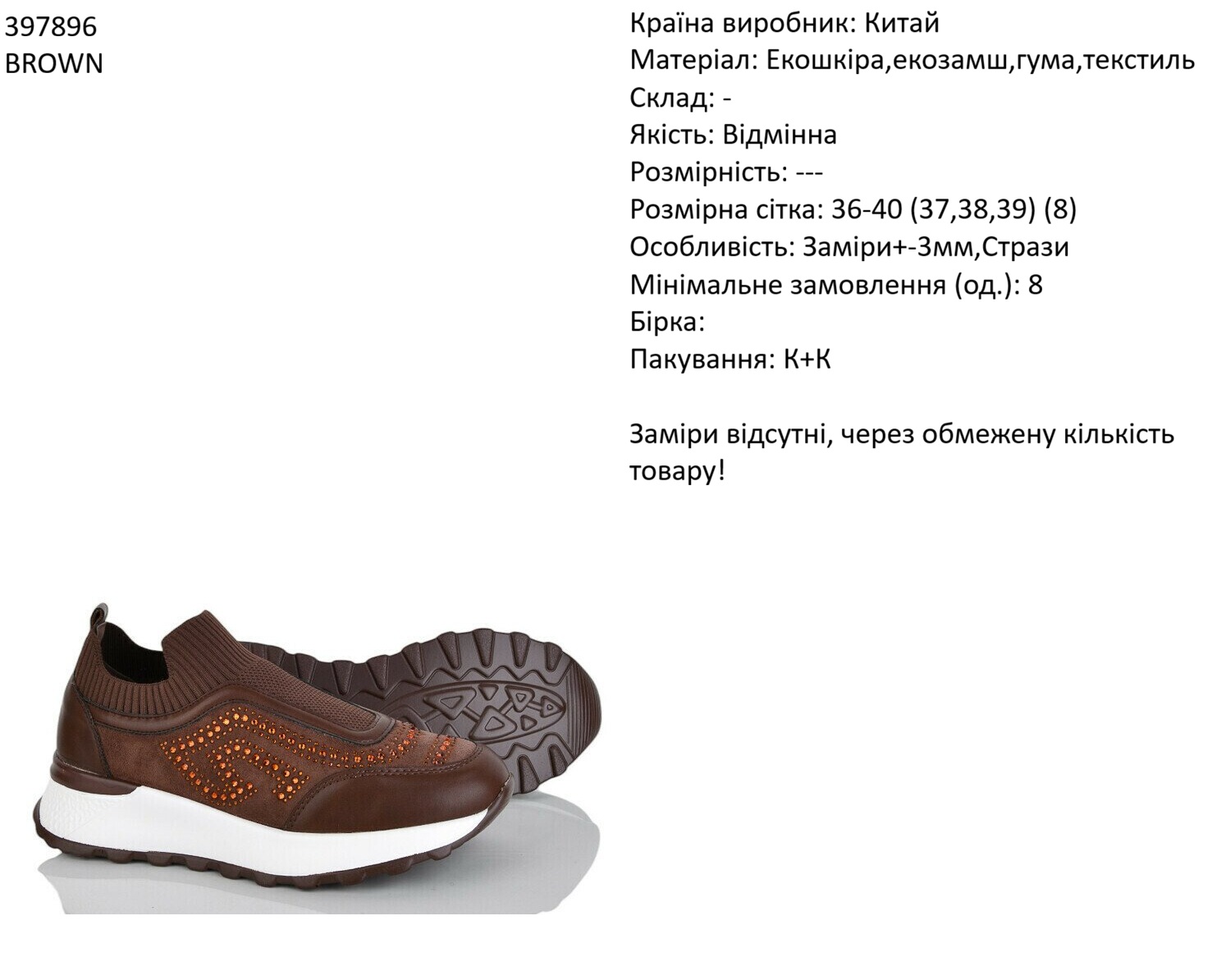 Страна производитель: Китай Материал: Экокожа,текстиль,резина Состав: Качество: Отличное Размерность: --- Размерная сетка: 36-41 38,39 (8) Особенность: Замеры +-3мм Минимальный заказ (ед.): 8 Бирка: Упаковка: К+К Замеры отсутствуют, из-за ограниченного количества товара!